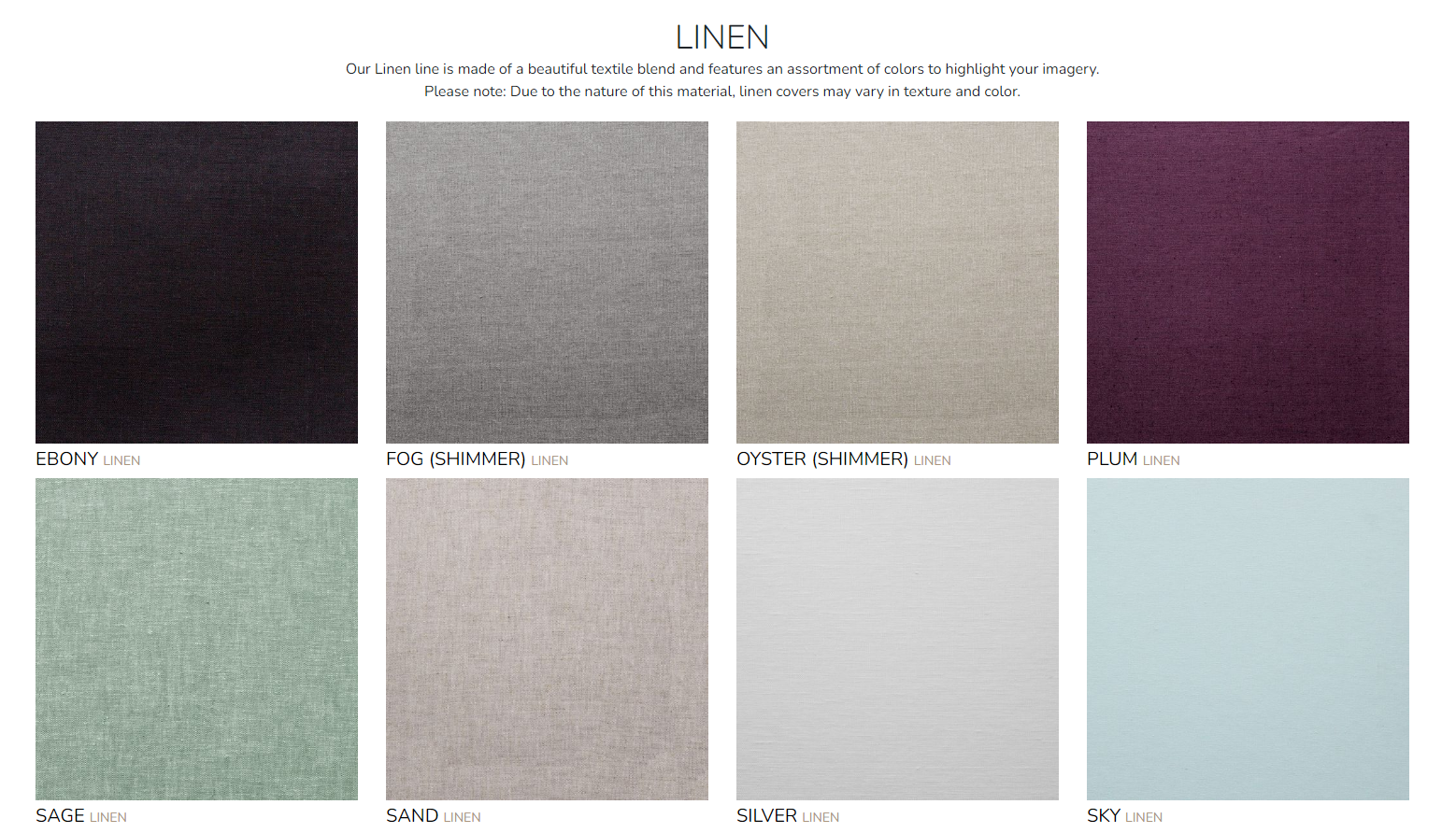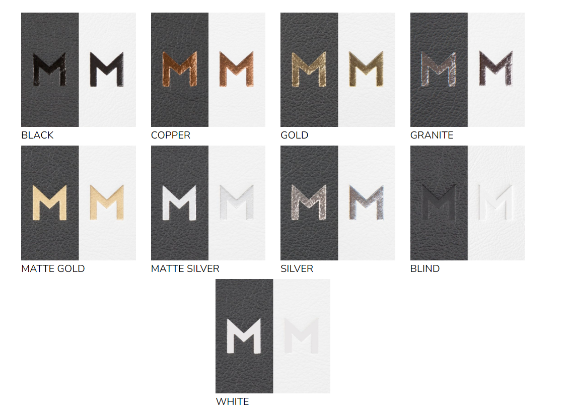 Below are the options for your album cover in Linen or various types of Leather along with your choices for adding text to your album. Happy choosing!